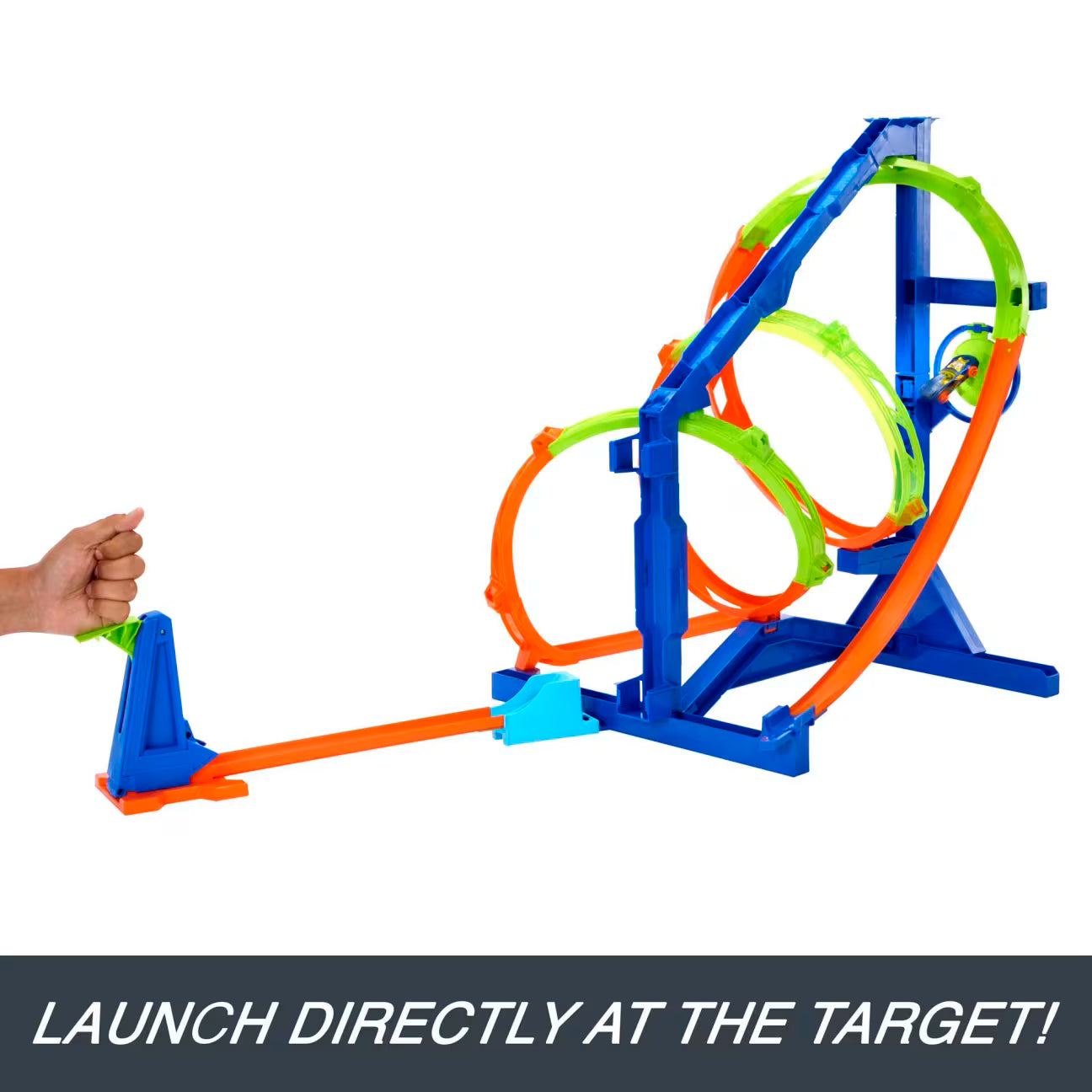 The Hot Wheels® Action Corkscrew Twist Kit™ challenges kids to launch cars through loops and make daring jumps! With two different set-up options, players can send their Hot Wheels® through corkscrew loops before leaping toward the target, or adjust the layout for a straight-shot launch at the target. Kids can experiment with speed and force to master the stunt, making every race a skill-based challenge. The launcher, target, and track pieces store neatly in designated spots for quick cleanup. Compatible with other Hot Wheels® tracks (sold separately) for endless building possibilities. Includes one Hot Wheels® car.
