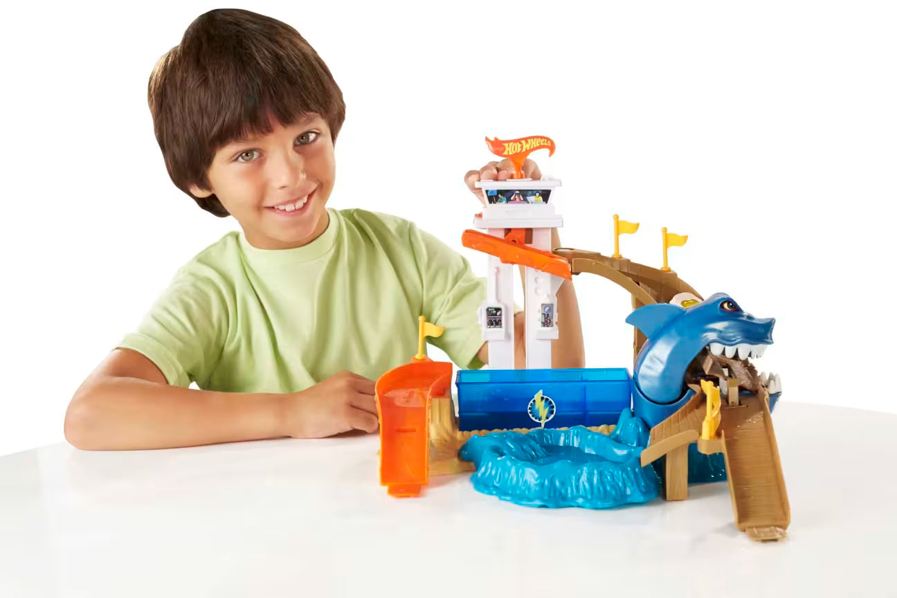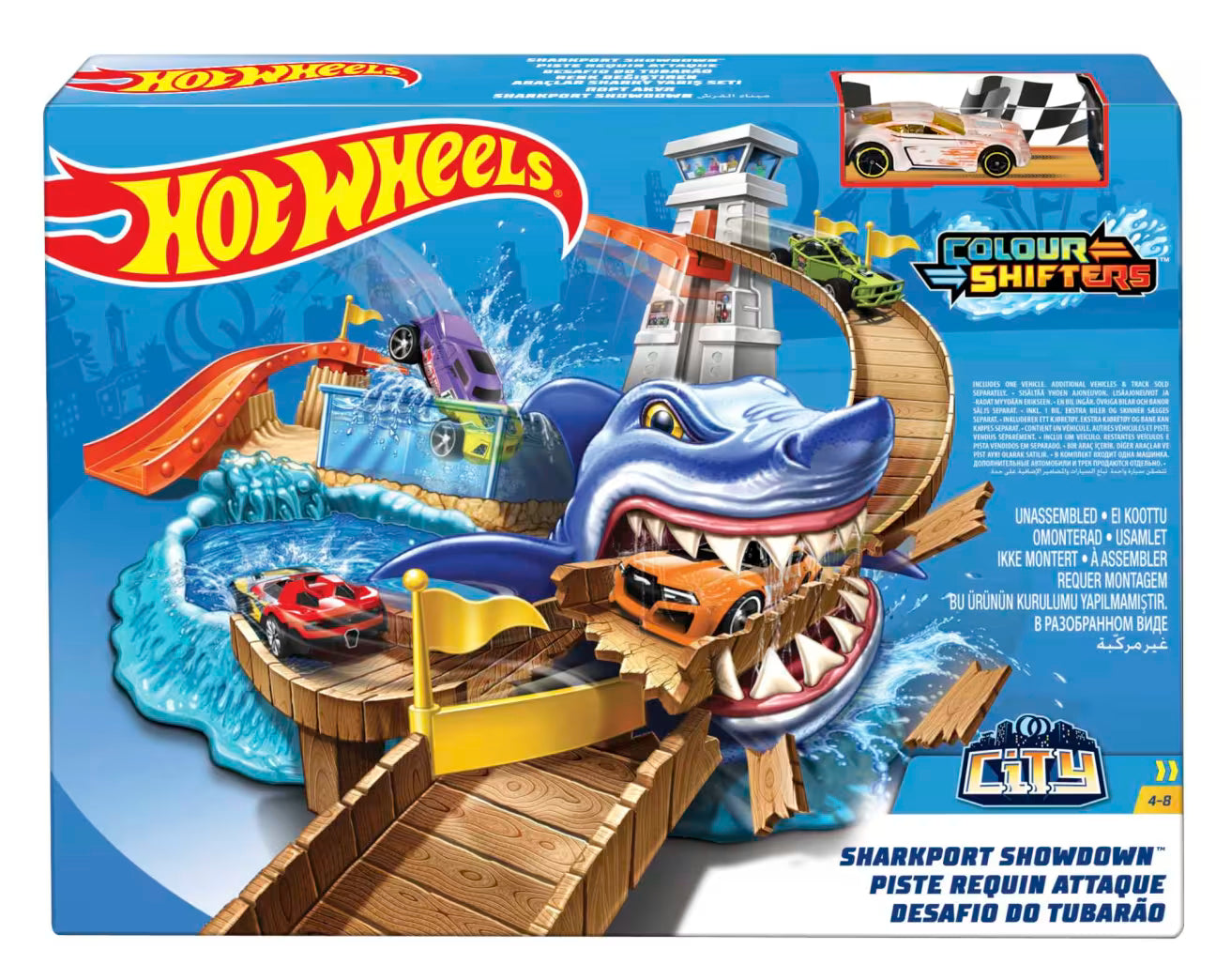 Race to safety in the Hot Wheels® Sharkport Showdown™, an action-packed, color-changing adventure! Launch your car from the top of the towering ramp, but beware—the giant, car-chomping shark is waiting to snap you up in its jaws. If your vehicle...