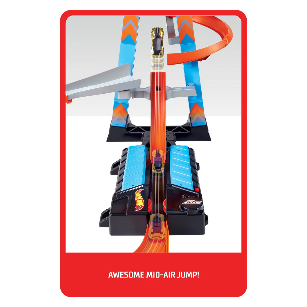 - Motorized booster powers cars through loops and jumps for epic mid-air stunt action.